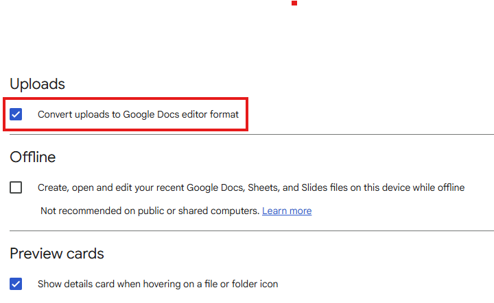 - Access this through the Settings icon (cog wheel), selecting Settings, and look for the Uploads header, and then check the box for Convert uploads to Google Docs editor format. This makes your files native Google Docs.